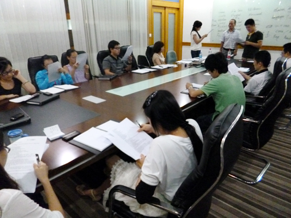 經(jīng)過兩周的精心籌備,第一期英語培訓活動于6月26日晚上7點至9點成功舉行。國際部全體同事參與了整個培訓的所有環(huán)節(jié),公司領導蒞臨旁聽,作為對本次活動的支持。首先,所有學員都介紹了自己的英文名,以便以后的英語交流;隨后,國際部的講師們對常用的幾個英語情景對話進行了講解,并親自示范情景對話,學員們也自由組合演繹口語對話,整個課堂氣氛活躍,歡笑聲陣陣。