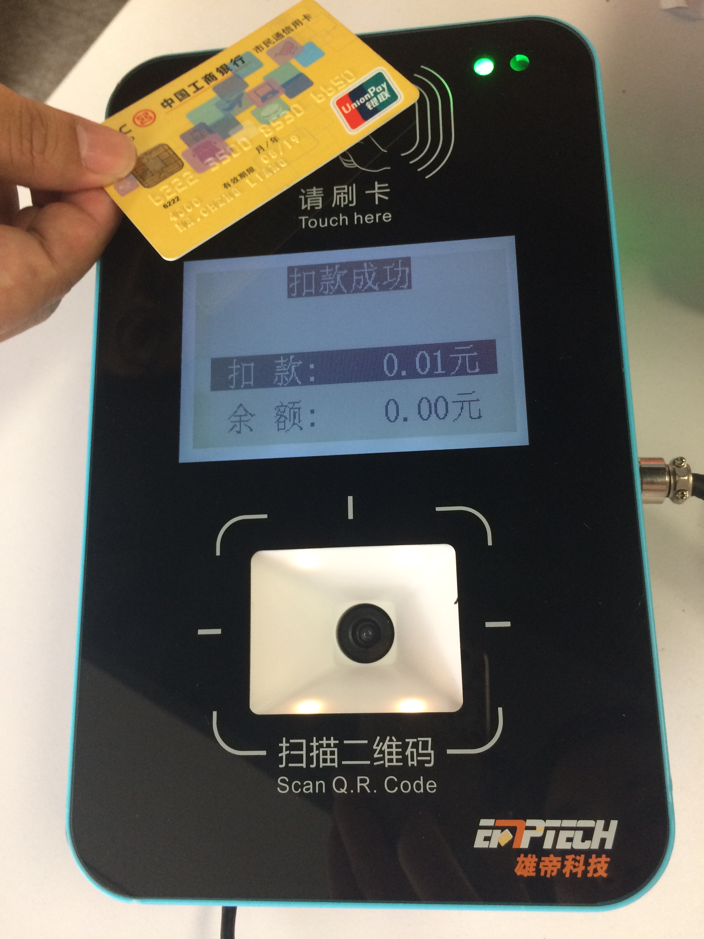 設(shè)備上方為閃付、云閃付功能區(qū),乘客使用具有IC芯片的銀行卡或通過(guò)具有NFC功能的手機(jī)即可“一觸”支付公交車費(fèi)。下方是二維碼識(shí)別功能區(qū),這里有高清掃描攝像頭,乘客打開(kāi)手機(jī)中的微信、支付寶等APP的付款二維碼,正對(duì)該區(qū)域的攝像頭,即可掃描支付車費(fèi)。